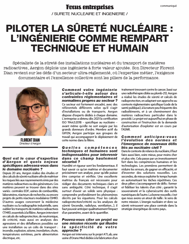 Aergon a eu l’honneur d’être conviée à s’exprimer via son directeur Florent DIAN dans une interview d’une page du magazine de l’école des Arts et Métiers de janvier-février 2026 intitulé « Nucléaire et innovations ».